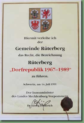Rüterberg erhielt 1991 das Recht, die Bezeichnung „Rüterberg Dorfrepublik 1967-1989“ zu tragen.